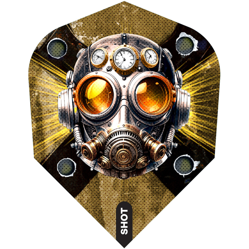 Die Shot Badlands The Sheriff Flight No.6 überzeugen durch ihre Standardform, die für zuverlässigen Auftrieb und präzise Kontrolle sorgt. Gefertigt aus strapazierfähigem 100-Micron-Material bieten sie eine hohe Langlebigkeit und Formstabilität. Das markante Steampunk-Design mit Gasmaske, kupferfarbenen Details und mechanischen Elementen verleiht den Flights einen einzigartigen Look. Gleichzeitig unterstützen sie eine gleichmäßige und stabile Flugbahn für konstant präzise Würfe.