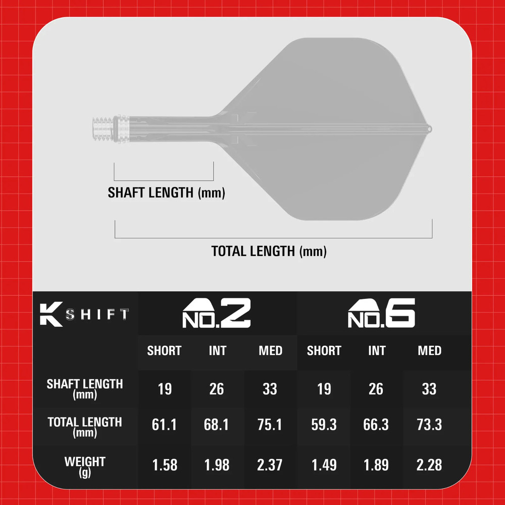 Das K-Shift System ist ein integriertes Flight- und Schaft-Design, das Ablenkungen und Bounce-outs reduziert. Durch kontrollierte Bewegung beim Aufprall können nachfolgende Darts näher am Ziel bleiben und sorgen für engere Gruppierungen sowie konstantere Ergebnisse.