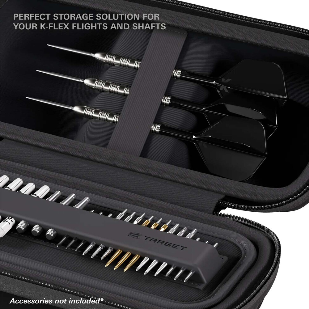 Die Tasche bietet Platz für bis zu 6 vollständig montierte Darts, sodass Sie diese zwischen den Spielen nicht zerlegen müssen. Ein internes Fächersystem sorgt für eine übersichtliche Aufbewahrung von 12 Dartschäften und 15 Swiss Point-Spitzen, während zusätzliche Fächer Platz für Flights, K-Flex-Zubehör, Swiss Point-Werkzeuge und andere unverzichtbare Utensilien bieten.